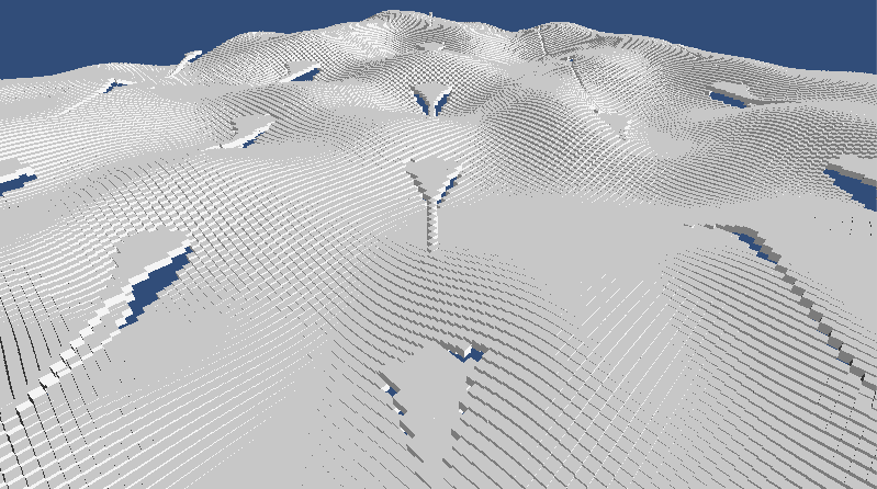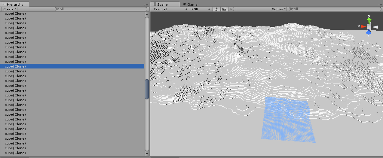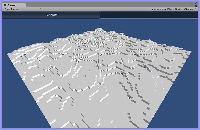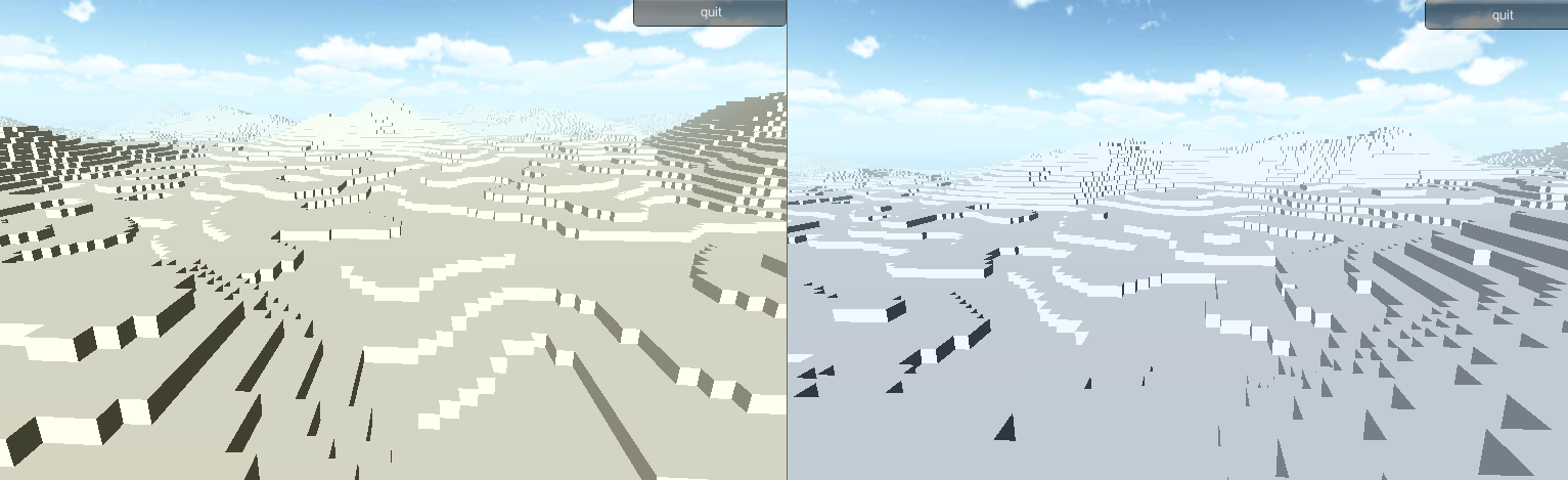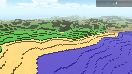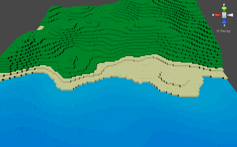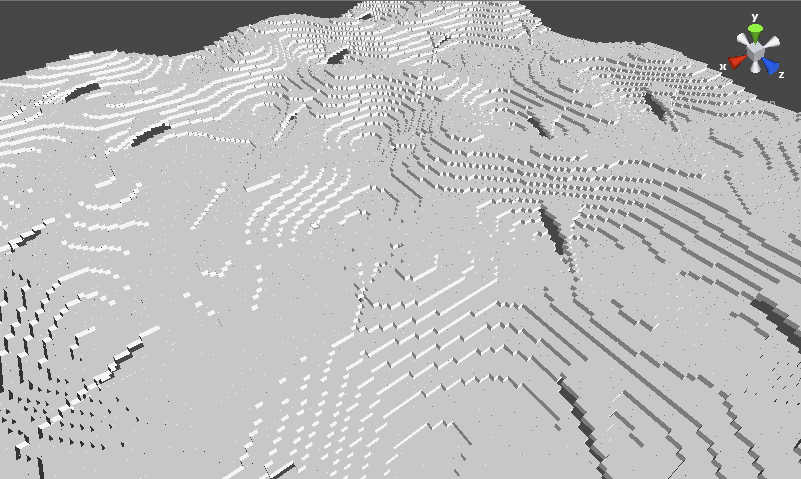 After I was happy with that I decided to get serious and generate the mesh chunks manually rather than instantiate cubes. There is a performance limit to how many objects can exist in a scene at a given time and if you think of a game like minecraft there are going to be thousands of cubes on screen at once. Because of this generating chunks was necessary to keep the number of objects in the scene to a minimum.