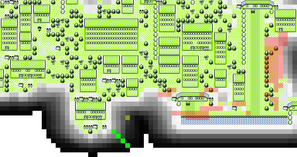 This house consists of one of the largest collections of unique tiles in Celadon city. Each end of the house must be above a boulder fence tile. These fence tiles appear nowhere else on the map and must terminate on the bottom with either brick road, or old man, and must terminate upwards into a side of the house, or into more fence. This is the only one story building on this map and aside from the two window tile each tile only shows up once. The white single right window must appear above the old man, the white single left window tile must appear over that particular road tile, and that road tile must terminate into water, which must terminate to the left and right into rock. If any of the house, rock fence, or water is chosen the house essentially needs to be generated in full, and if there isn't enough space it can easily get stuck in a position where it would take far too long to ever actually complete.